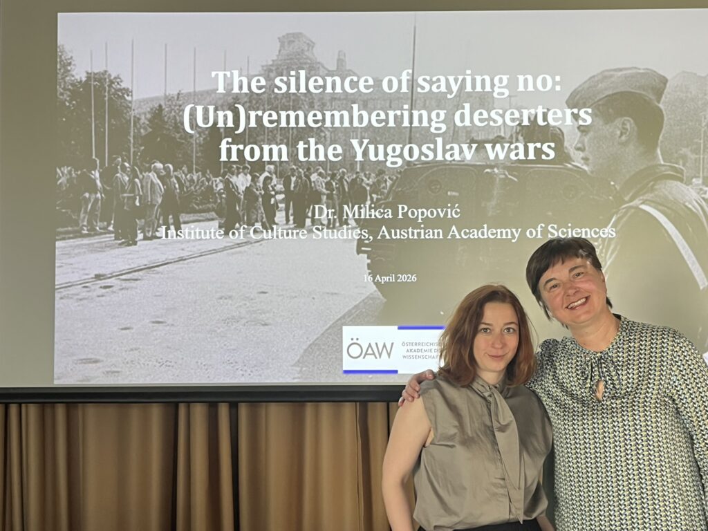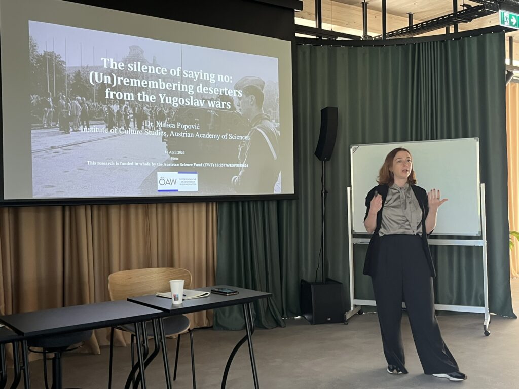 U četvrtak 16. travnja 2026. Centar za studije mira i konflikata Sveučilišta u Rijeci ugostio je dr. sc. Milicu Popović, poslijedoktorandicu na Institutu za kulturalne studije Austrijske akademije znanosti u Beču. Dr. Popović je voditeljica istraživačkog projekta The Silence of Saying No: (Un)Remembering Deserters from the Yugoslav Wars, prvog sveobuhvatnog istraživanja o pojedincima i skupinama koji su odbili sudjelovati u oružanim sukobima na području bivše Jugoslavije tijekom 1990-ih.