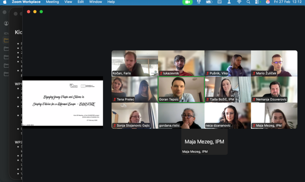 U petak, 27. veljače 2026., zajedno s partnerskim organizacijama službeno smo pokrenuli međunarodni projekt EUINSPIRE – Engaging Young People and Citizens in Shaping Policies for a Reformed Europe, koji će trajati do veljače 2028. Na početku projekta partneri su održali virtualni uvodni sastanak na kojem su pregledali ključne ciljeve projekta, predstavili planirane aktivnosti te uskladili okvir suradnje među partnerima.