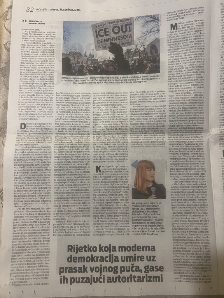 Doc. dr. sc. Tena Prelec, iz Centra za studije mira i konflikata Sveučilišta u Rijeci, dala je opsežan intervju za Večernji list u kojem upozorava na sve izraženiju demokratsku regresiju u svijetu i rast populističkih i autoritarnih tendencija.